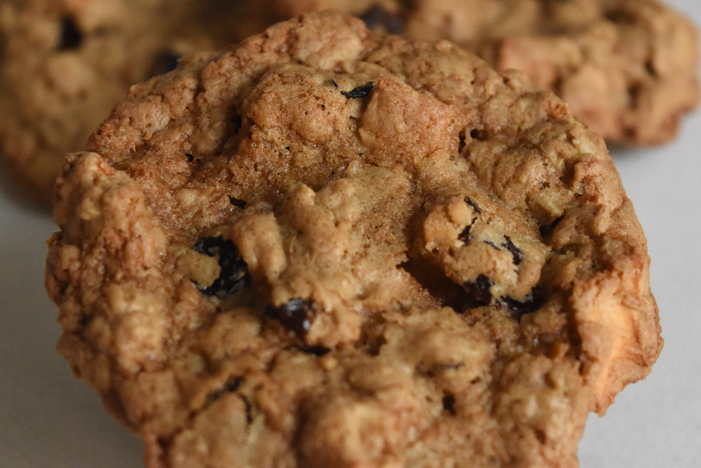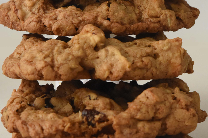 Crujientes galletas de avena, manzana deshidratada y pasas con mantequilla endulzadas con azúcar mascabado.
