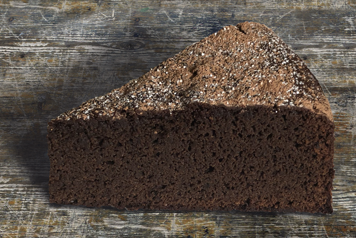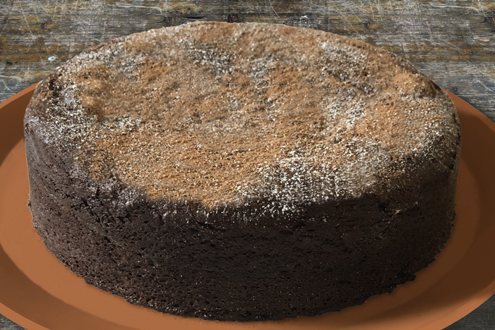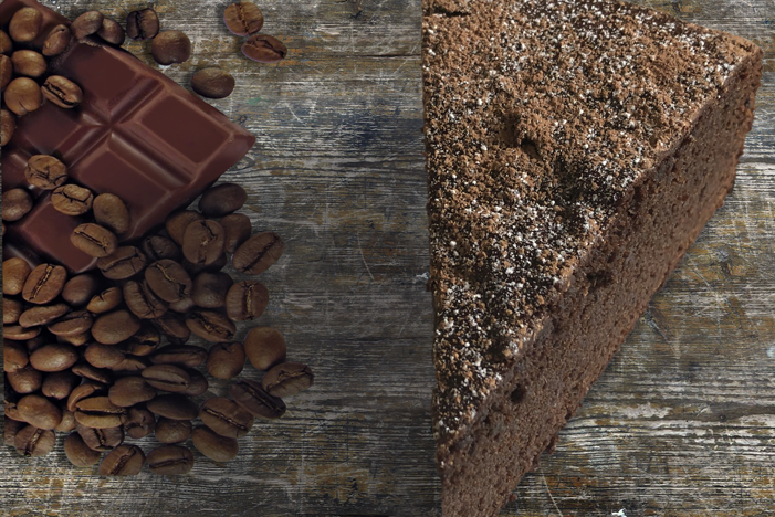 Delicioso pastel de chocolate y café expresso, elaborado con aceite de uva y endulzado con dátil, ciruelas y azúcar moscabado.